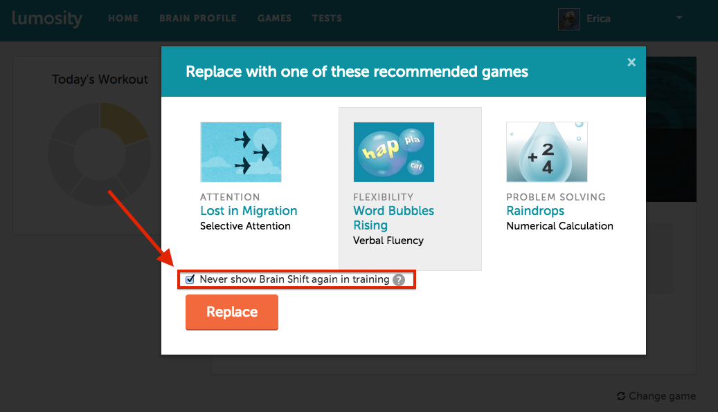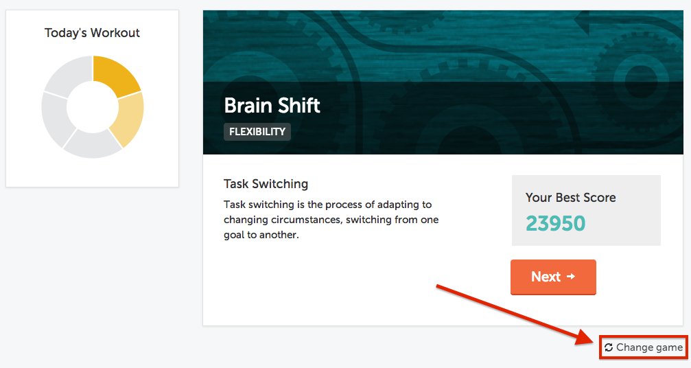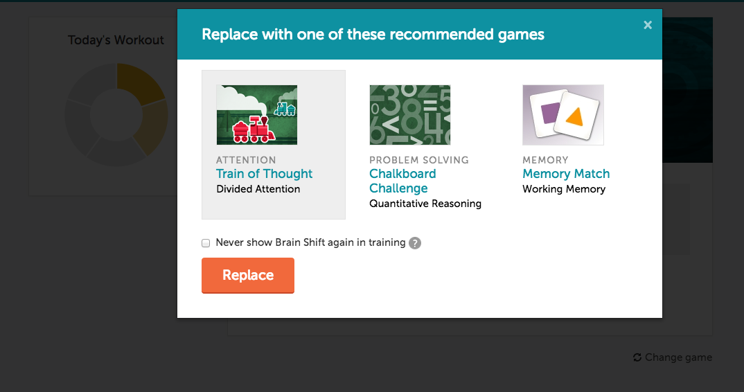 上記と同じ手順をとりますが、「このゲームを今後のトレーニングに含めない」というチェックボックスをチェックします。その後オレンジ色の「ゲームを変更」ボタンをクリックすると、最初に提示されたゲームはこのセッションで置き換えられ、今後のトレー二ングにも現れません。 このオプションではゲームを5つまで削除でき、その後は表示されません。