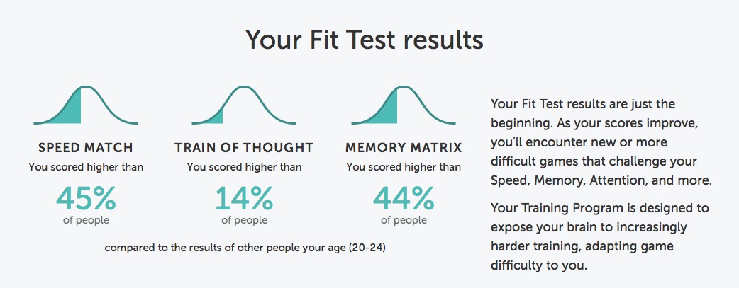 セッションで呈示される3つのゲームを完了すると、他の Lumosity ユーザーのフィットテストとの比較を表す結果をお見せします。結果はあなたのトレーニングプログラムを作成するのに使われます。